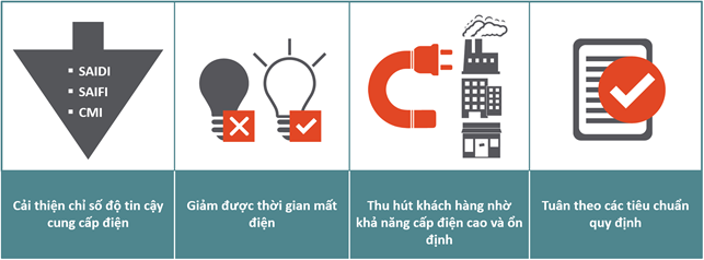 - Cải thiện các chỉ số độ tin cậy cung cấp điện SAIFI, SAIDI, CMI, …